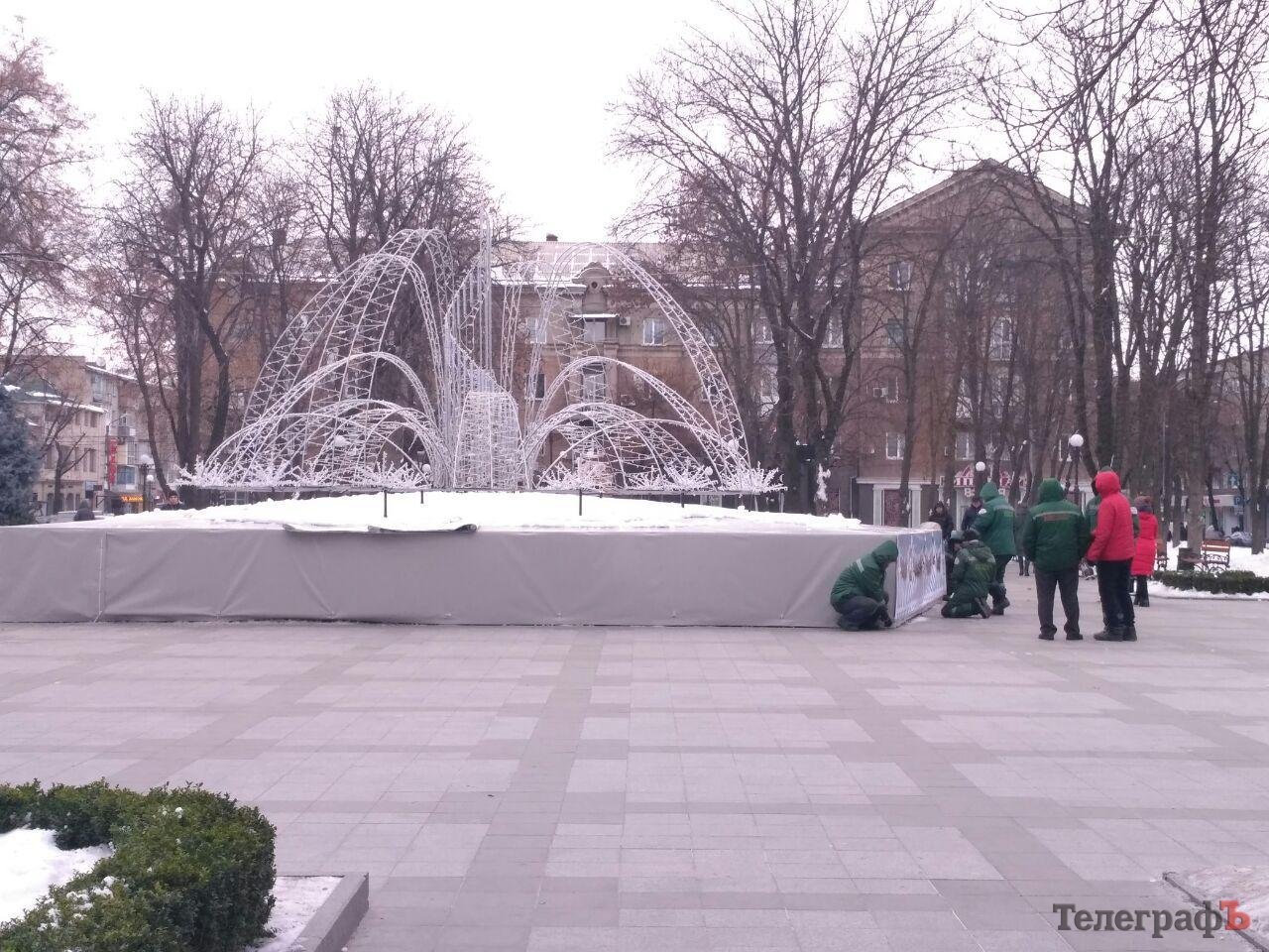 Вже встановили світлодіодну конструкцію та прикрасили дерева навколо. Сьогодні ж, 17 грудня, плівкою обклеїли периметр фонтану.