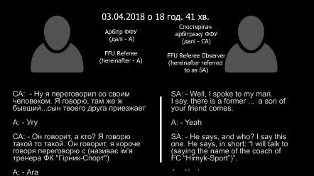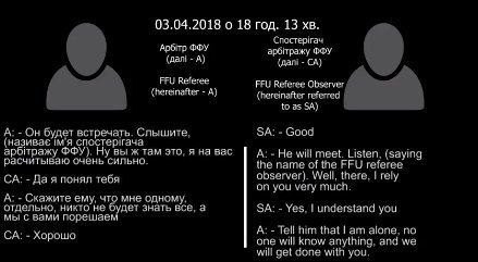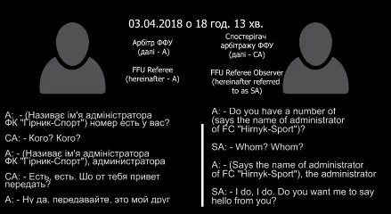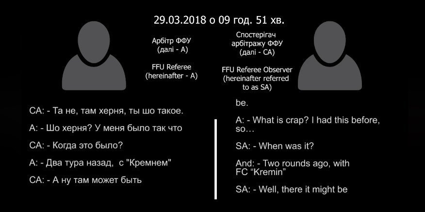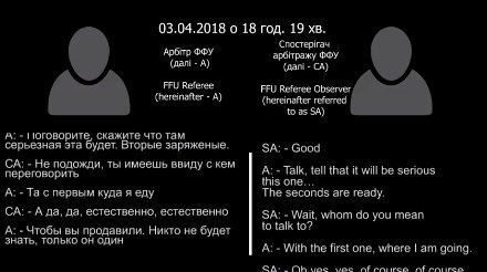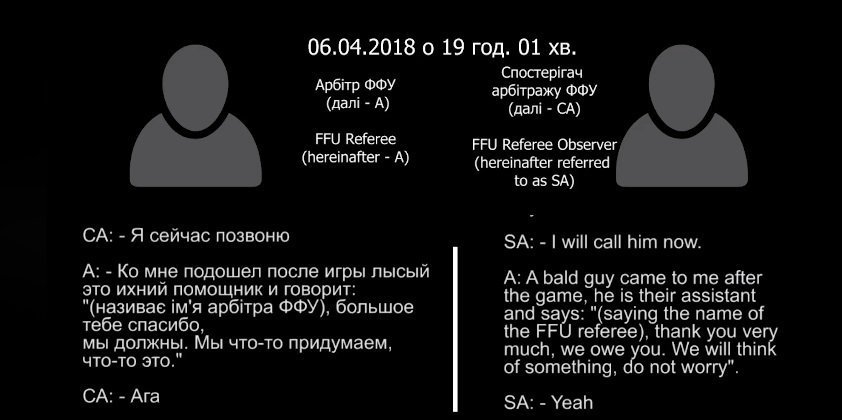Департамент захисту економіки спільно з поліцією зафіксували розмову між арбітром ФФУ та його дружиною, в якій арбітр повідомив, що обидві команди пропонували велику кількість коштів за перемогу, він міг би закінчити ремонт, але команди зіграли внічию і він отримав «копійки». Дружина повідомила, що по приїзду вони сходять до церкви, тому що, швидше за все, його чоловіка «наврочили», тому він не може отримати достатньо хабарів за суддівство.