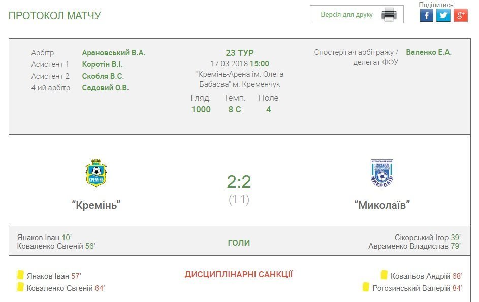 УТОЧНЕНО. Розрахунки щодо допомоги «Колоса» не справдились й «Миколаїв» переміг з рахунком – 1:0. Це був 25 тур чемпіонату в Першій лізі сезону 2017-2018. 2 тури до цього «Кремінь» грав з «Миколаєвом», цей матч судив Віктор Арановський, який схоже домовлявся з Дмитром Бондаренком про допомогу команді з Миколаєва. Віктора Арановського підозрюють в участі у договірних матчах, зараз проти нього та ще низки суддів тривають слідчі дії. Проти ще одного фігуранта Дмитра Бондаренка розпочаті слідчі дії.
