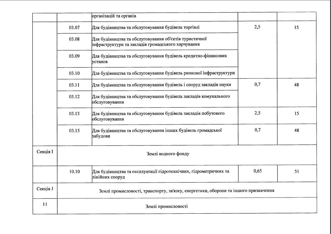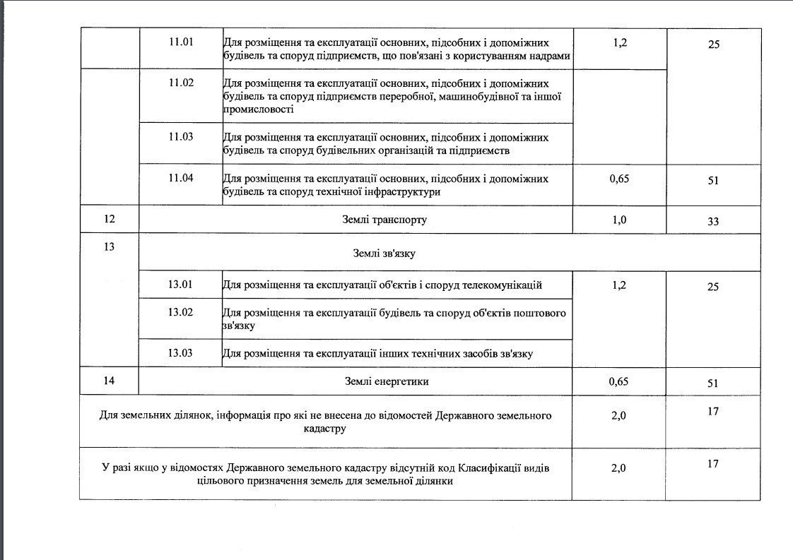 Отже, відповідно до рішення від 11 травня 2017 року, яке пролонгували ще на рік — до 31 грудня 2019 року понижуючий коефіцієнт для визначення плати за землю варіюється від 15% (для будівництва та обслуговування об’єктів торгівлі; для будівництва та обслуговування об’єктів побутового обслуговування) до 51% (для розміщення та експлуатації будівель і споруд технічної інфраструктури).