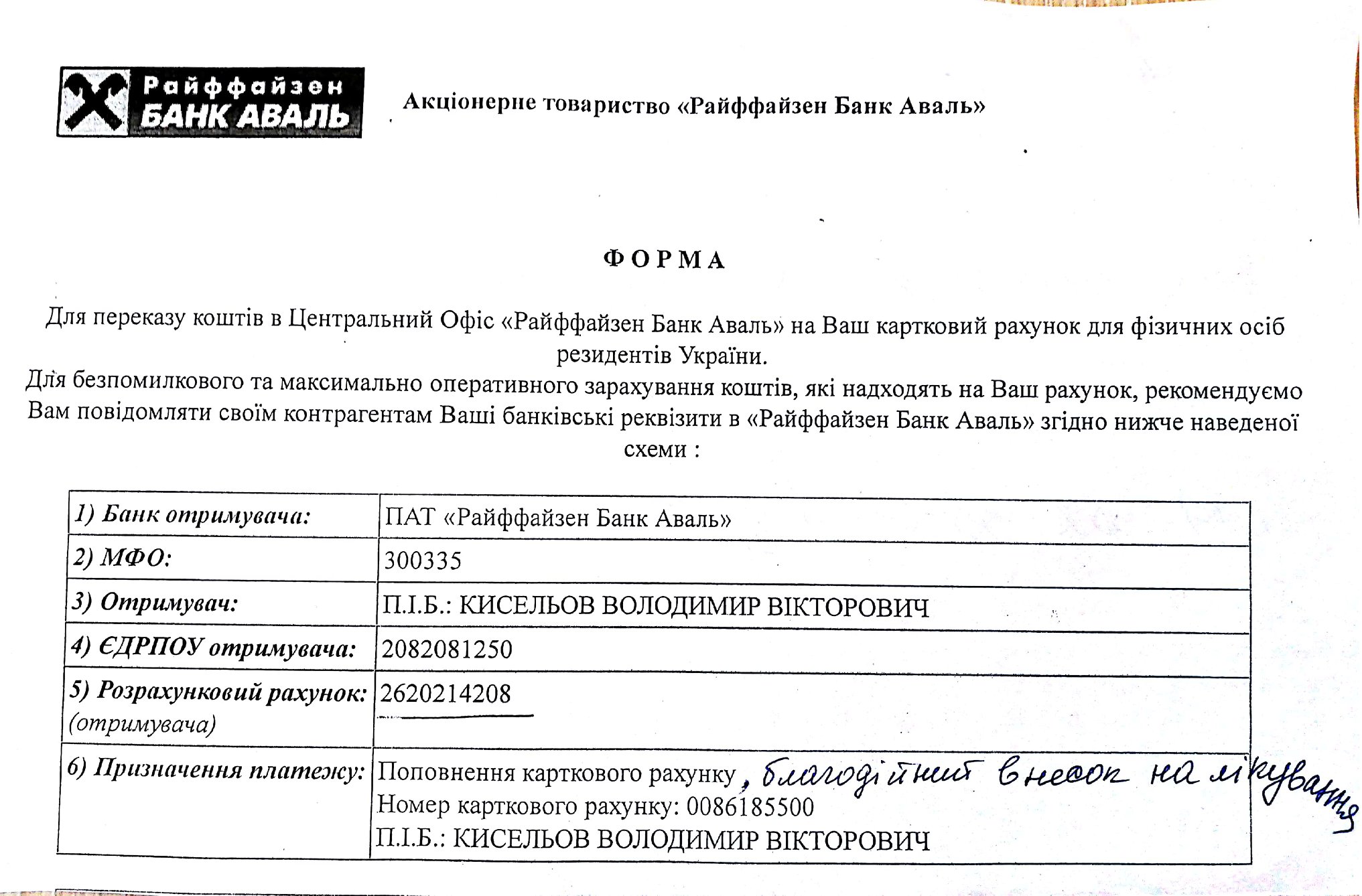Номер карткового рахунку в «Райффайзен Банк Аваль»: 0086185500