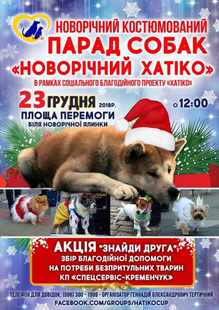 23 декабря нас ожидает много «милоты» - новогодний парад собак в рамках полюбившегося кременчужанам «Кубка Хатико» возле главной ёлки города на площади Победы. Как встретишь Новый год, так его и проведешь: Год Собаки уже встречали костюмированным парадом, и это получилось грандиозно. Так почему бы не повторить и не проводить уходящий год?