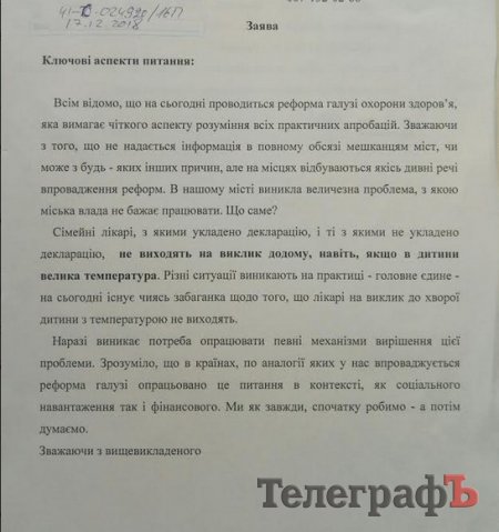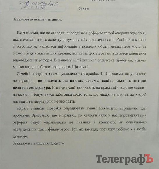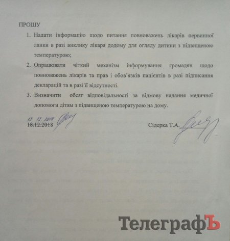 Депутат Кременчугского горсовета Татьяна Сидерка сообщила «Телеграфу», что она начинает сбор подписей кременчужан под коллективным обращением к и. о. министра здравоохранения Супрун. Обращение касается отказа педиатров в Кременчуге выходить на вызов домой к детям с высокой температурой. Сбор подписей планируют начать со следующей недели.