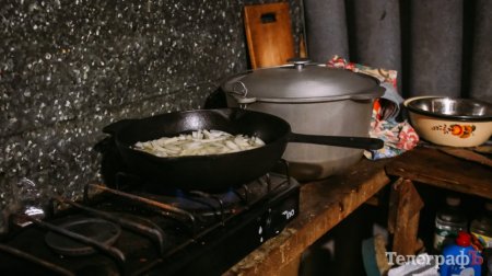 Ось на кухні порається білявка Світлана, з нею ми познайомилися на полігоні «Широкий лан». Оскільки Світлана за фахом медик, вона намагається організувати харчування не лише смачним, а й збалансованим. На обід борщ або суп, багато консервації, цибулі й часнику – взимку те що треба.