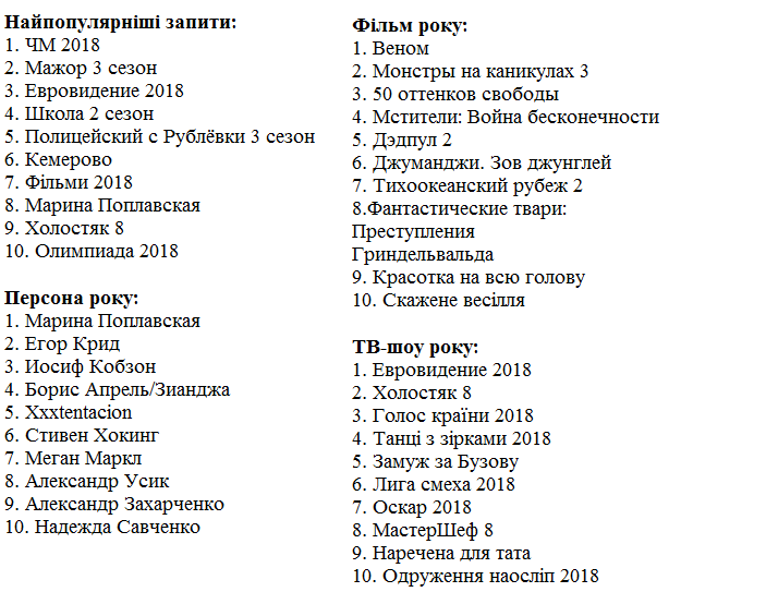 Найпопулярнішим запитом став «ЧМ 2018» (чемпіонат світу з футболу), друге місце посів «Мажор», третю сходинку – «Євробачення-2018».