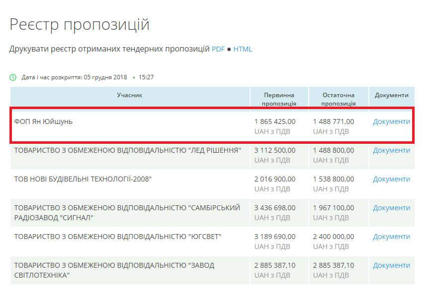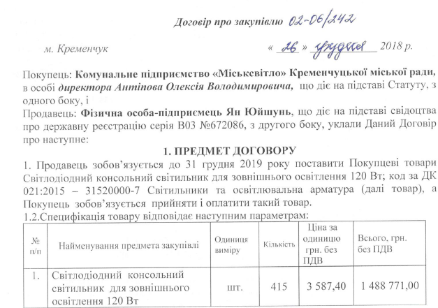 У результаті, відповідно до договору, ФОП має поставити покупцеві 415 світильників. Ціна одного ліхтаря – 3 тис 587 гривень. Уся партія коштує 1 млн 488 тисяч 771 гривня.