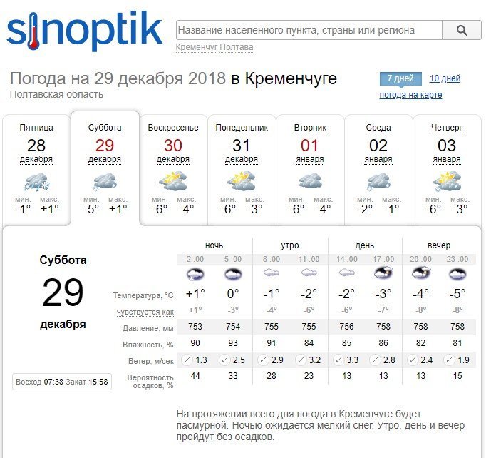 За прогнозом Rp5, у суботу, 29 грудня, буде переважно плюсова температура. Цілий день Кременчук буде оповитий серпанком і туманом. Післяобід сніжитиме. У неділю, 30 грудня, температура повітря спаде до -5, переважно без опадів.