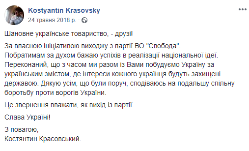 Він у перший день з’їзду заявив на своїй сторінці в фейсбук про вихід з партії. Для більшості однопартійців даний хід став несподіванкою.