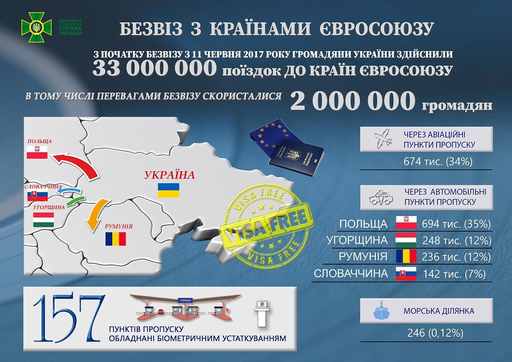 Загалом з початку безвізового режиму громадяни України здійснили 33 мільйони поїздок до країн ЄС, з яких 2 мільйони саме без віз.