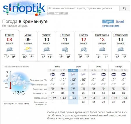 Синоптики обіцяють кременчужанам нічні морози. Погода у вівторок, 8 січня, на Полтавщину принесе зниження температури. Так, подекуди температура повітря опуститься до -16°С. Про це повідомили в Полтавському обласному центрі з гідрометеорології.