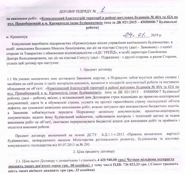 4 січня Комунальне виробниче підприємство «Кременчуцьке міське управління капітального будівництва» підписало договір підряду щодо комплексного благоустрою території з ТОВ «АДС ТРЕЙД». Предмет договору – «Комплексний благоустрій території в районі житлових будинків № 40А та 42А по вул. Правобережній у м. Кременчуці (нове будівництво)».