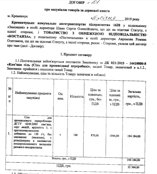 Згідно з договором, сіль закуплять у ТОВ «Костанза». Одна тонна без ПДВ коштує 870 гривень. Загальна вартість закупки становить 194 тис 184 гривень.