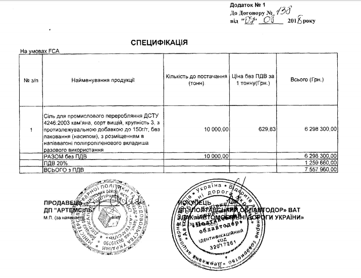 Ймовірно, якби КАТП-1628 придбало сіль напряму в ДП «Артемсіль», а не в ТОВ «Костанза», коштів витратили б менше. Такі висновки ми зробили, поглянувши на закупівлю солі у липні 2018 року Полтавським автодором у «Артемсолі». Згідно зі специфікацією, одна тонна без ПД обійшлася у 629,83 грн. Тим часом Кременчук купив одну тонну солі без ПДВ за 870 грн. Хоча, можливо, таку ціну можна пояснити підвищенням цін за півроку.