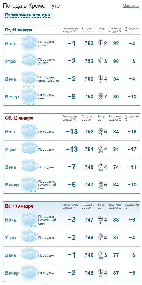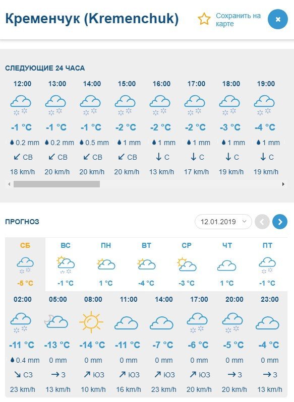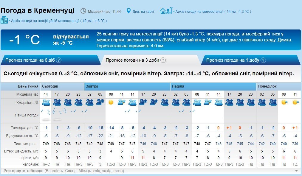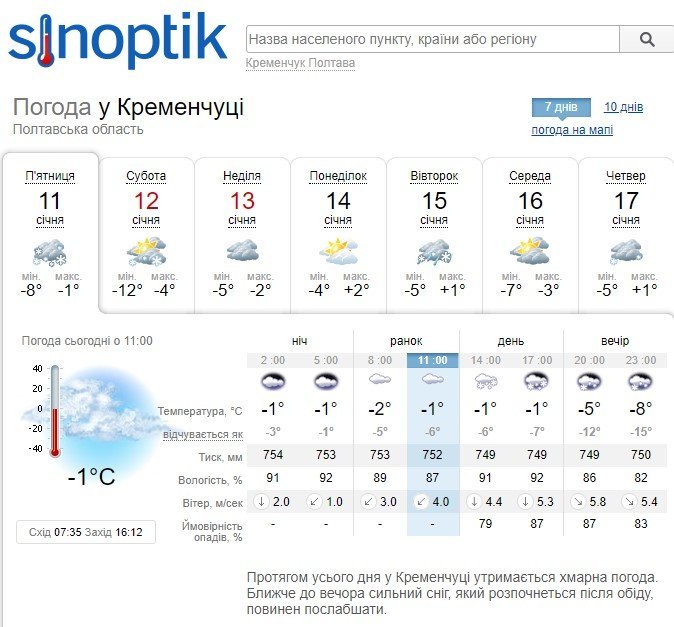 За прогнозом Gismeteo, сильний сніг у Кременчуці почнеться підвечір. Також сніжитиме в ніч на неділю, 13 січня. увесь інший час буде сухо і похмуро. прогнозований температурний мінімум – -13°С, максимум – -1°С.