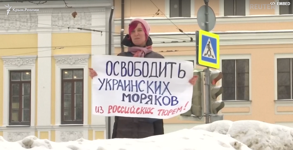 Під стінами суду проходили одиночні пікети, з закликом звільнити українських моряків. Люди тримають в руках плакати «Свободу українським морякам».