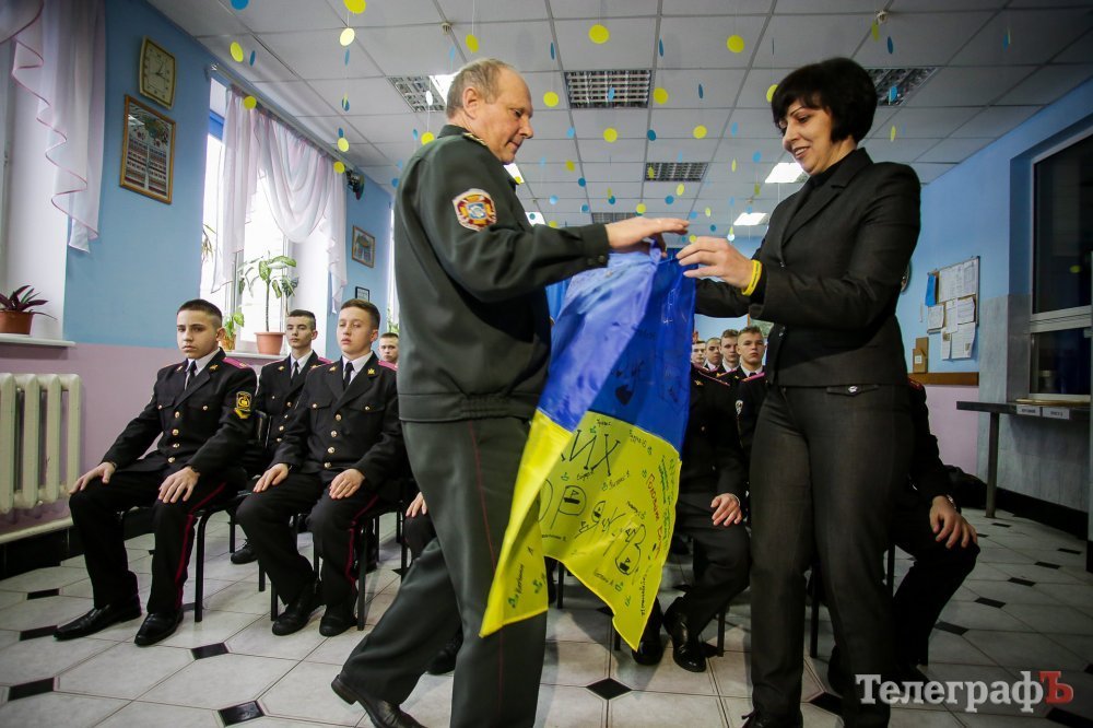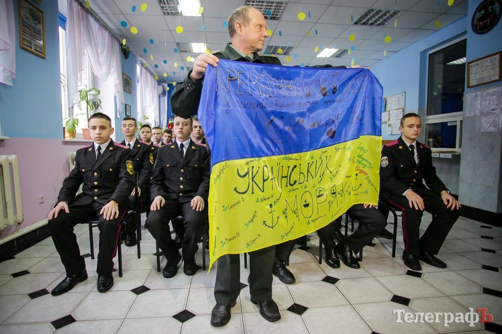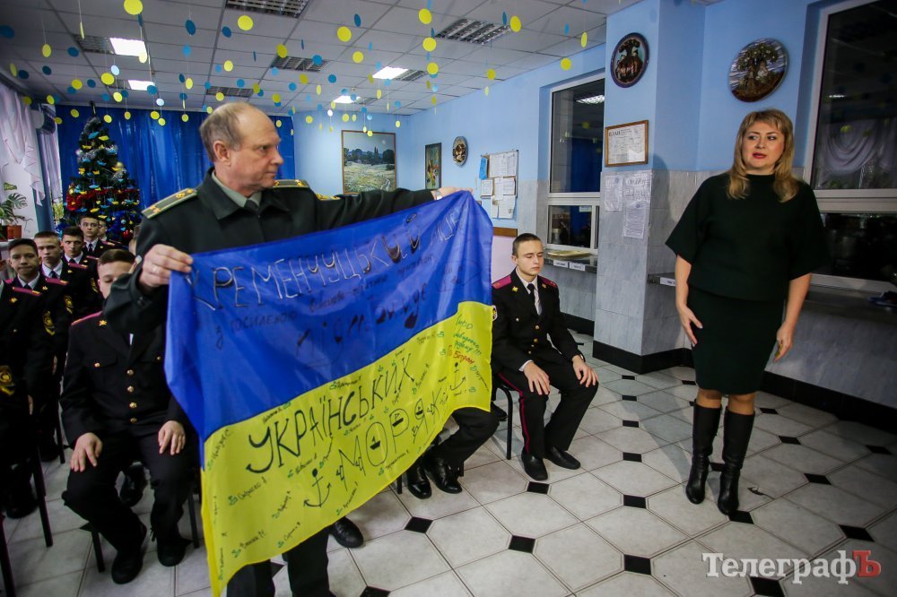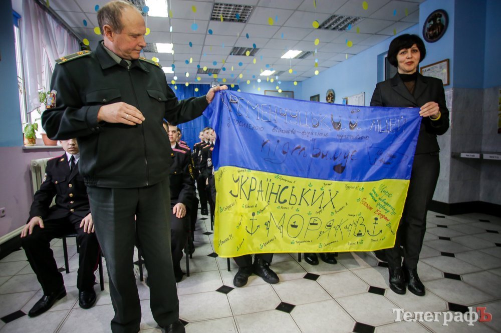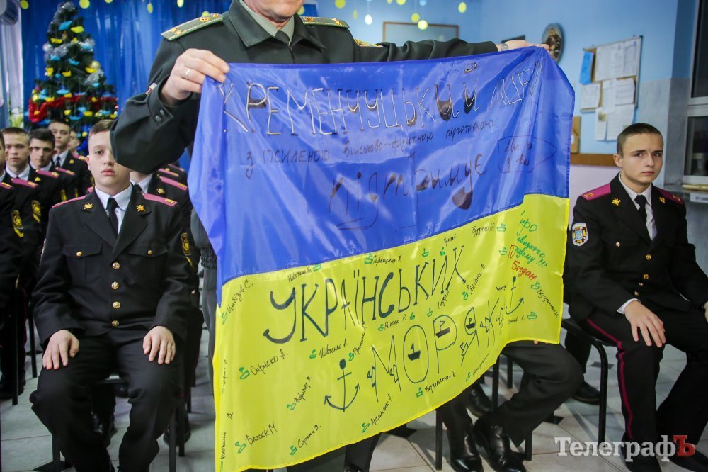 Майбутні військові одночасно виконували рухи й бажали якнайшвидшого повернення додому. Ліцеїсти також підготували ще кілька сюрпризів: прапор Військово-морських сил з жовто-блакитними корабликами та прапор України з побажаннями. Прапор з рук заступника керівника Військового ліцею отримала тітка Богдана Юлія Халімон.