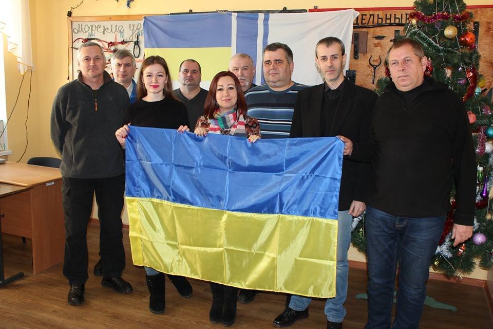Викладачі клубу «Гардемарин» сфотографувалися з прапором України та ВМС.