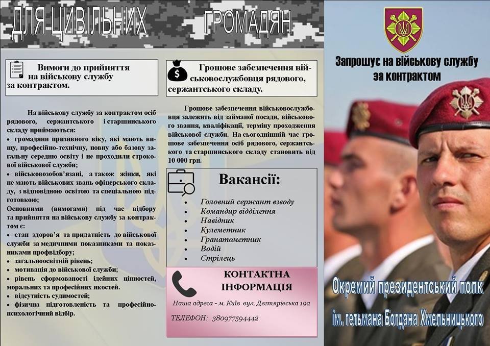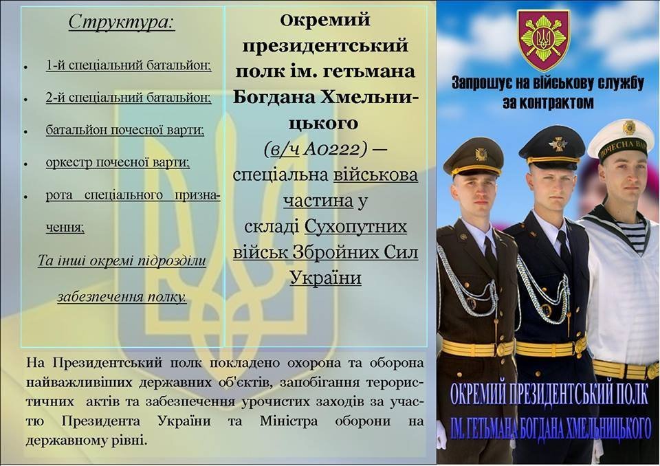 Кременчуцький ОМВК запрошує на військову службу за контрактом до в/ч А0222 (Окремий президентський полк ім. Богдана Хмельницького).