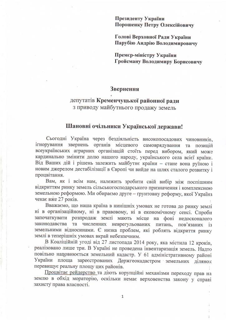25 января депутаты Кременчугского районного совета обратились к Президенту Украины, главе Верховной Рады и Премьер-министру Украины с требованием продлить мораторий на продажу сельскохозяйственных земель до 2025 года. Обращение было поддержано большинством голосов.