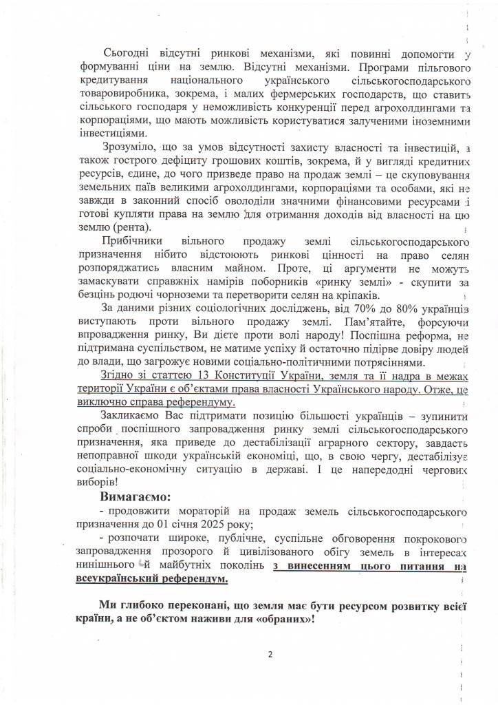 начать широкие, публичные, общественные слушания пошагового внедрения прозрачного и цивилизованного оборота земель в интересах нынешнего и будущих поколений с вынесением этого вопроса на всеукраинский референдум».