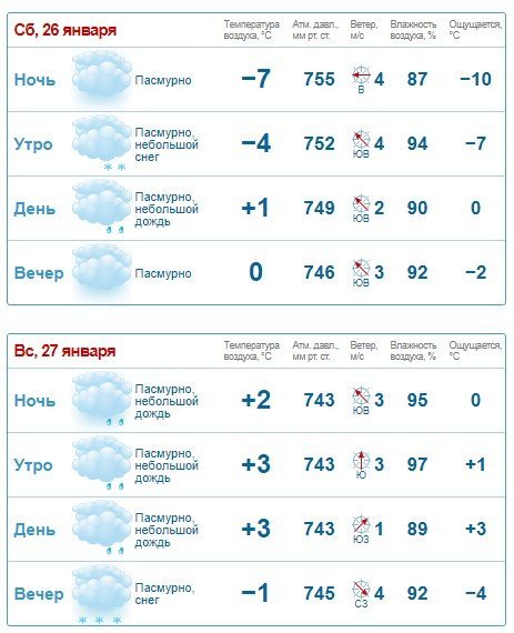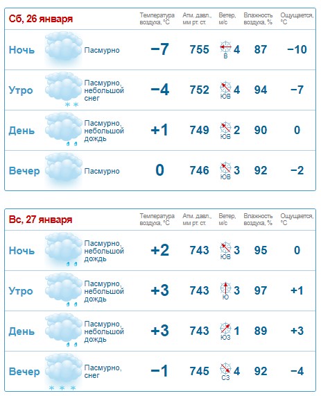 Gismeteo прогнозирует что в субботу, 26 января, утренний снег днём превратится в дождик, а воздух прогреется до +1°С. А в воскресенье, 27 января, потеплеет до +3°С и дождь будет капать весь день. Лишь вечером снова приморозит и дождик станет снежком.