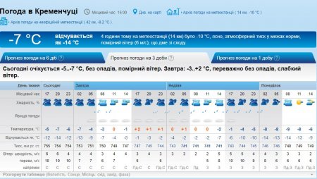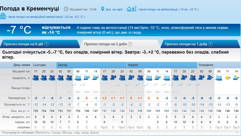 По прогнозу rp5, весь викенд Кременчуг будет окутан дымкой, а снег будет сменятся дождём и даже ливнем. Ожидаемая температура воздуха -7°С...+2°С.