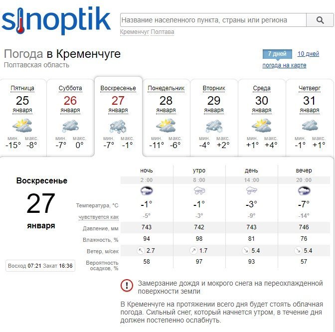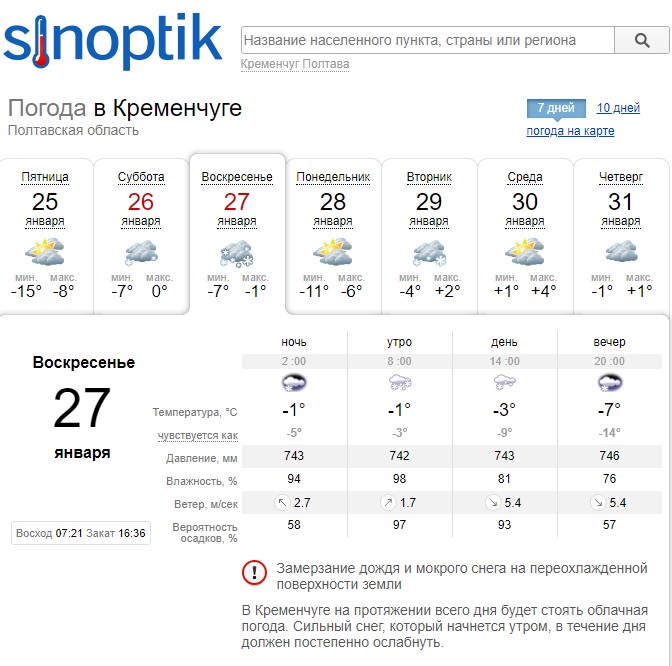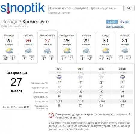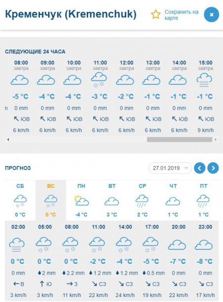 Днём воскресенья, 27 января, по информации Украинского гидрометеорологического центра, ожидают ухудшения погодных условий: значительный снег (прирост снежного покрова 8-15 см). Но погодные сайты ничего подобного Кременчугу не сулят.