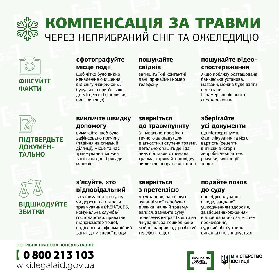 Центр бесплатной правовой помощи Министерства юстиции подготовил для украинских граждан шпаргалку на случай, если не дай Бог, они пострадают от падения на их головы снега-льда, от падения на скользком участке дороги.
