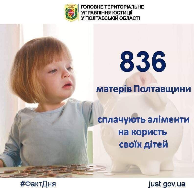 На Полтавщині 836 жінок сплачують аліменти на користь своїх дітей. Про це зазначив начальник Головного територіального управління юстиції в Полтавській області Олег Тимченко.