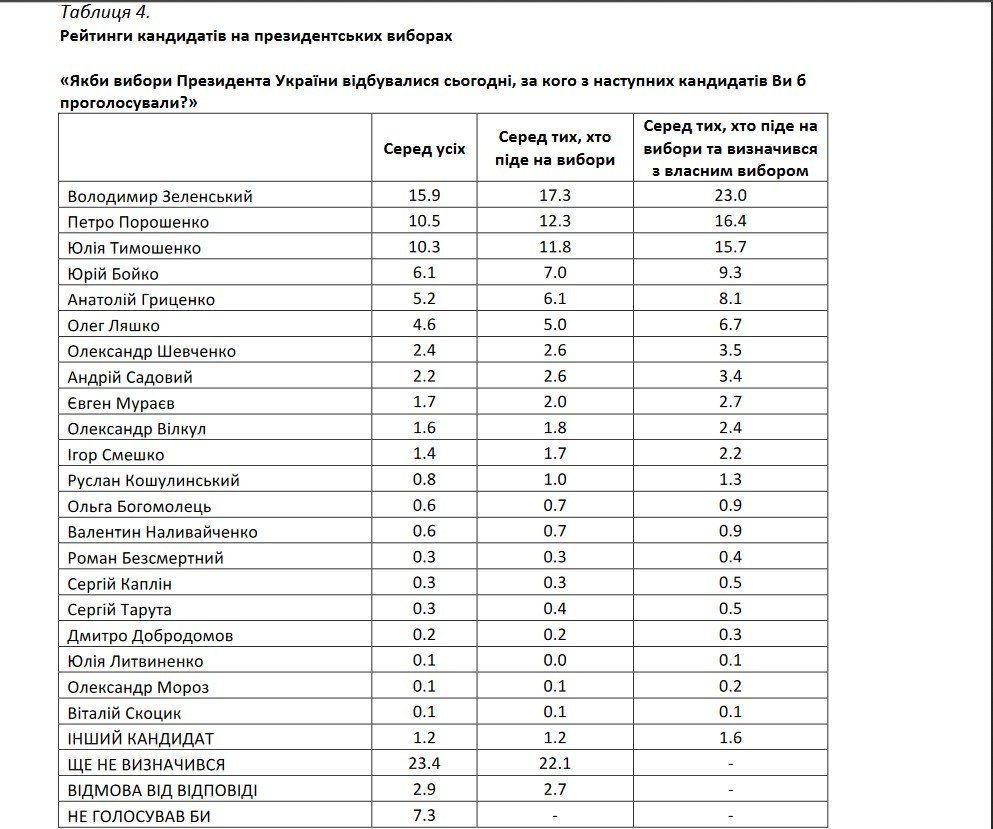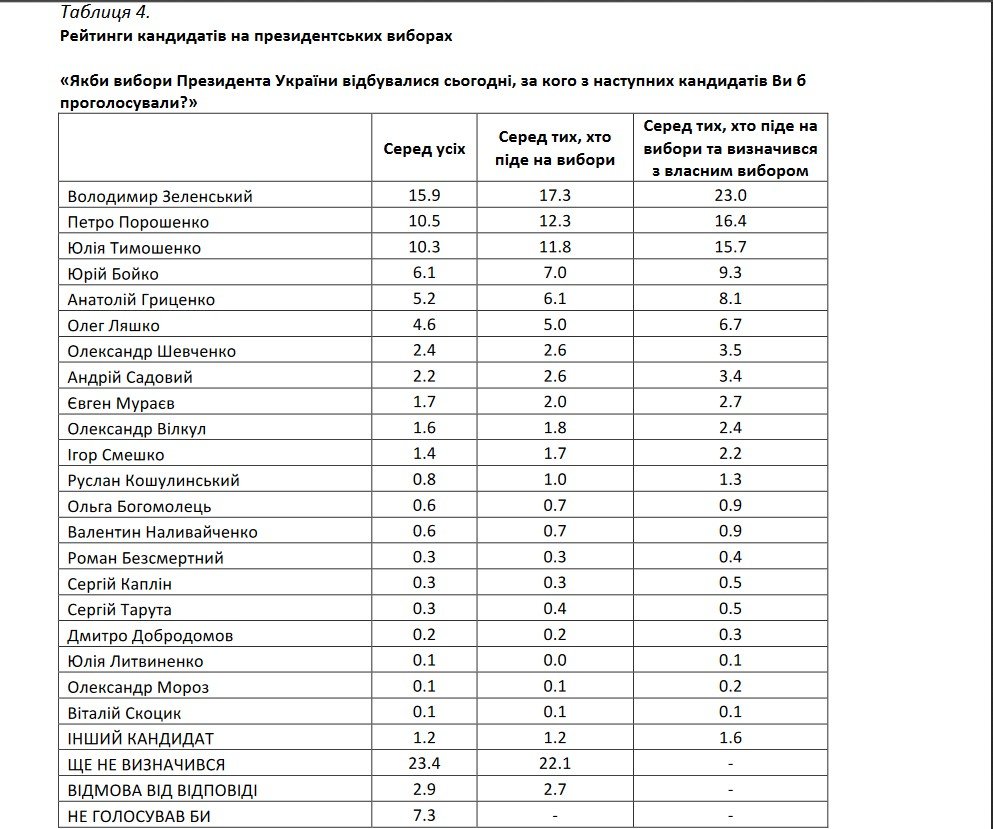 Результаты опроса всех групп респондентов (в том числе и не определившихся, пойдут ли они голосовать) отличается от приведенных показателей – но лидирует там тоже Зеленский.