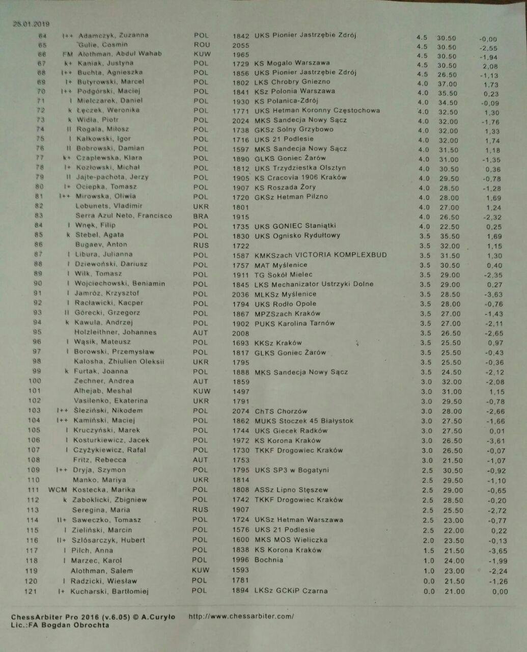 На радість місцевих вболівальників другим призером став з 7,5 очками Тобіас Смол, який на пів-очка поступився грузинському шахісту Звіада Патсіа. Також поляк випередив на пів-очка групу з трьох шахістів, з числа яких третім призером став 74-річний Данііл Русев з Росії.