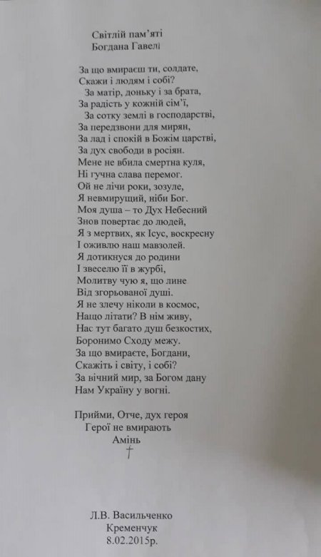 Сьогодні, 4 лютого, на території Міністерства оборони України відбувся ранковий церемоніал вшанування військовослужбовців Збройних Сил України, які загинули цього дня у різні роки та внаслідок російської збройної агресії на Сході України. Дзвін Пам’яті пролунав 4 рази. Цього дня у 2015 році перестали битися серця 4 мужніх захисників, які героїчно захищали Україну. Серед них і кременчужанин - сержант Богдан Гавеля.