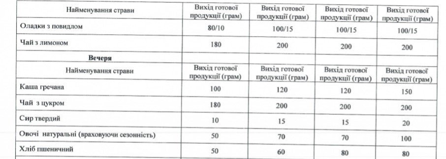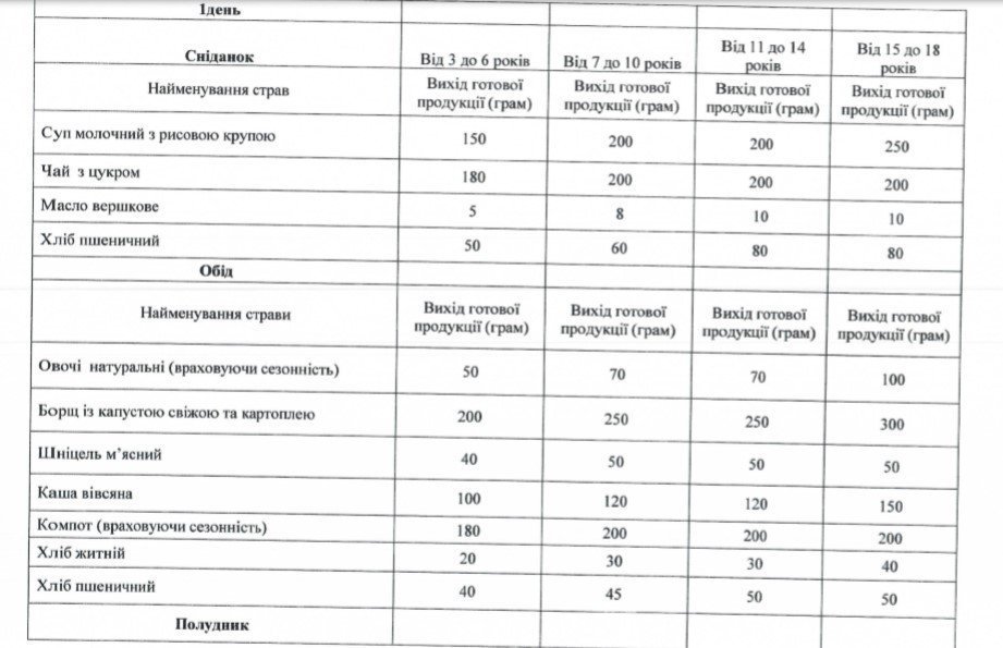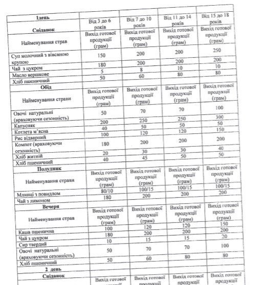 «Дніпрпродсервіс», фрагмент меню, дети от 3 до 18 лет