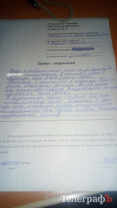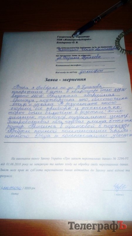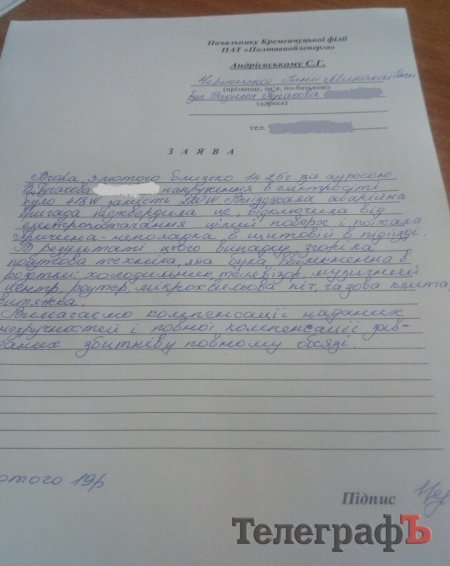Крім того, Інна написала заяву щодо компенсації на ім’я начальника Кременчуцької філії ПАТ «Полтаваобленерго».