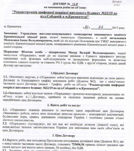 На порталі публічних закупівель «Прозорро» є звіт про укладений договір щодо «Реконструкції шиферної покрівлі житлового будинку №22/19 по вулиці Соборній у Кременчуці». Уклали договір 20 квітня 2017 року. Завантажити договір можна тут .