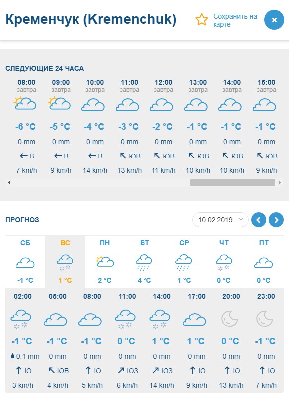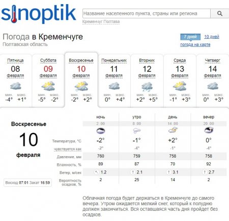 Sinoptik прогнозирует, что облачная погода будет держаться в Кременчуге до самого вечера субботы, 9 февраля. Без осадков, мороз до -3°С. Утром воскресенья, 10 февраля, ожидается мелкий снег, который к полудню должен закончиться. Воздух прогреется до +2°С.