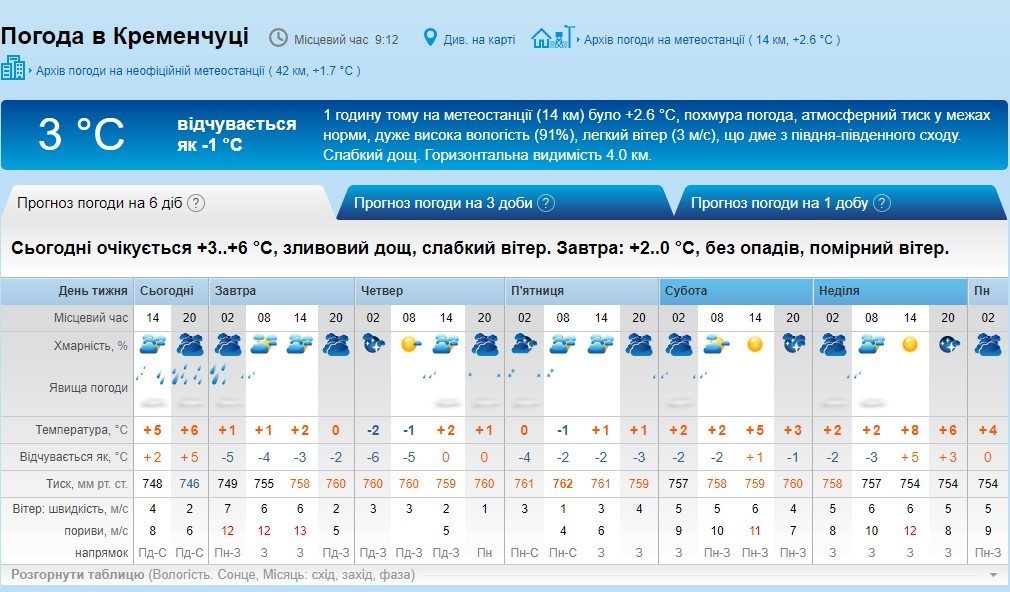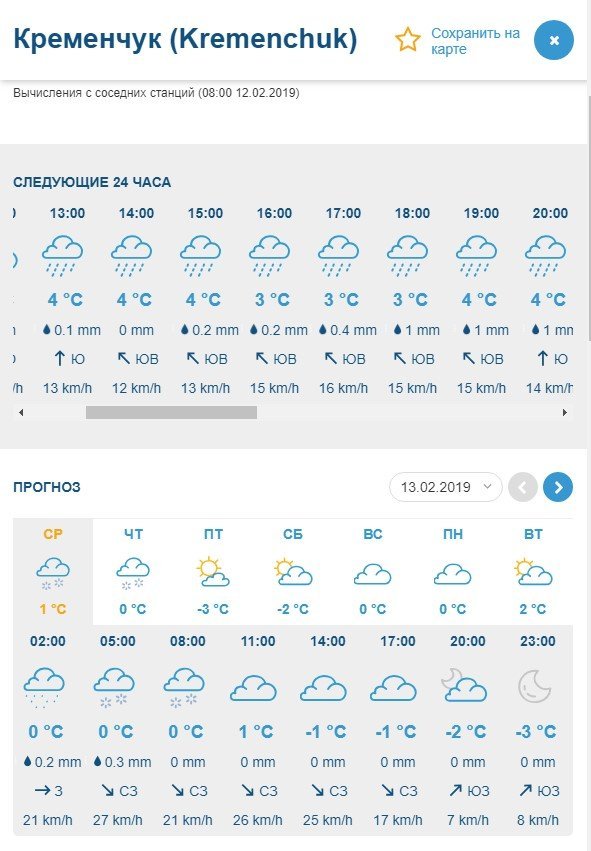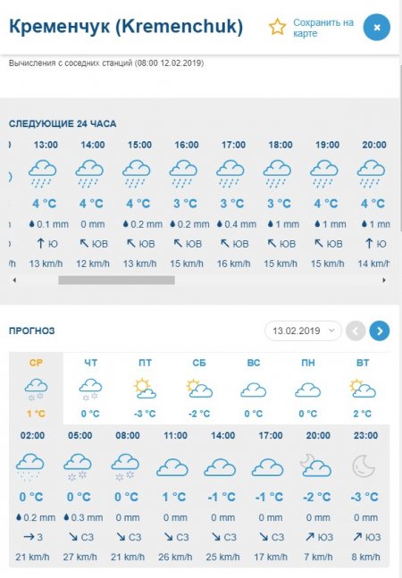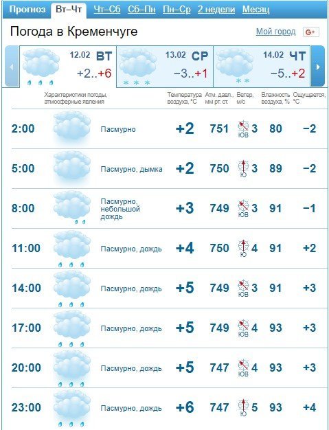 Rp5 прогнозує кременчужанам цілу зливу, яка не припиниться до ранку середи, 13 лютого. Крім того, у середу ще й здійметься вітрюган з поривами до 13 м/с. Невеликий сніжок тут нам обіцяють аж на вихідні.