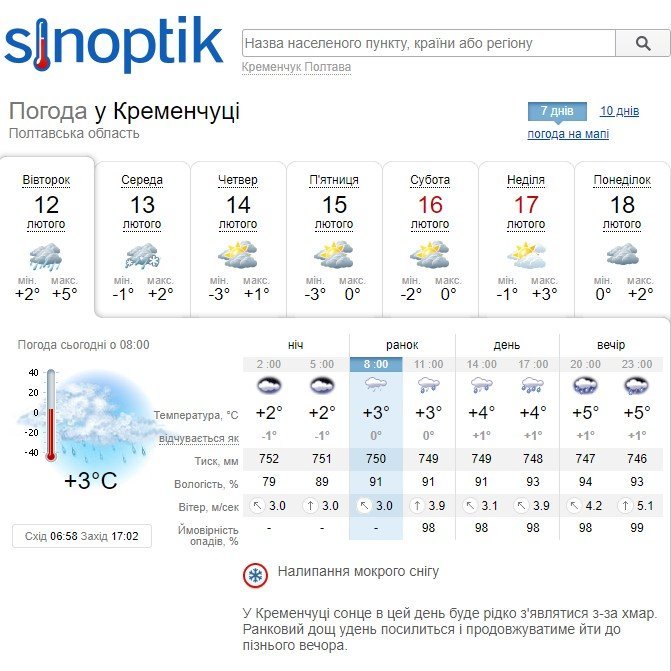 Sinoptik прогнозує Кременчуку одразу і дощ цілий день, і налипання мокрого снігу. А у середу, 13 лютого, – дощ зі снігом.