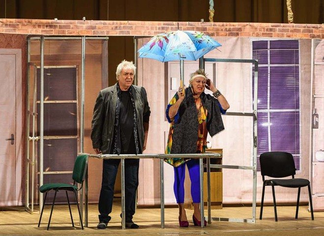 Актеры рассказали кременчужанам непростую историю отношений между соседями Роем и Полли. Однажды в квартиру Полли ворвался вор. Рой пошел спасать соседа. В результате передряги у Роя случился инсульт: у него парализовало правую часть тела, мужчина не мог разговаривать.