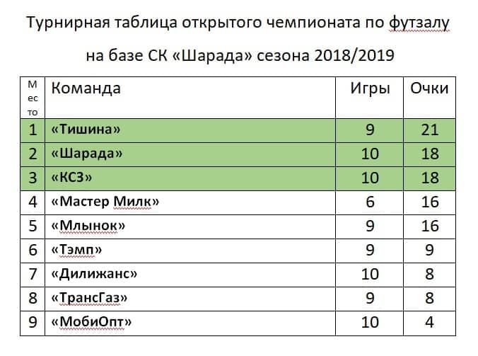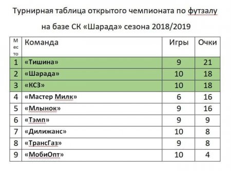 Трійка лідерів виглядає так: лідирує команда "Тиша" - 21 очко. До речі, варто відзначити, що команда йде без жодної поразки. На другому/третьому місці розташувалися команди "КСЗ" та "Шарада", які мають у своєму активі по 18 пунктів.
