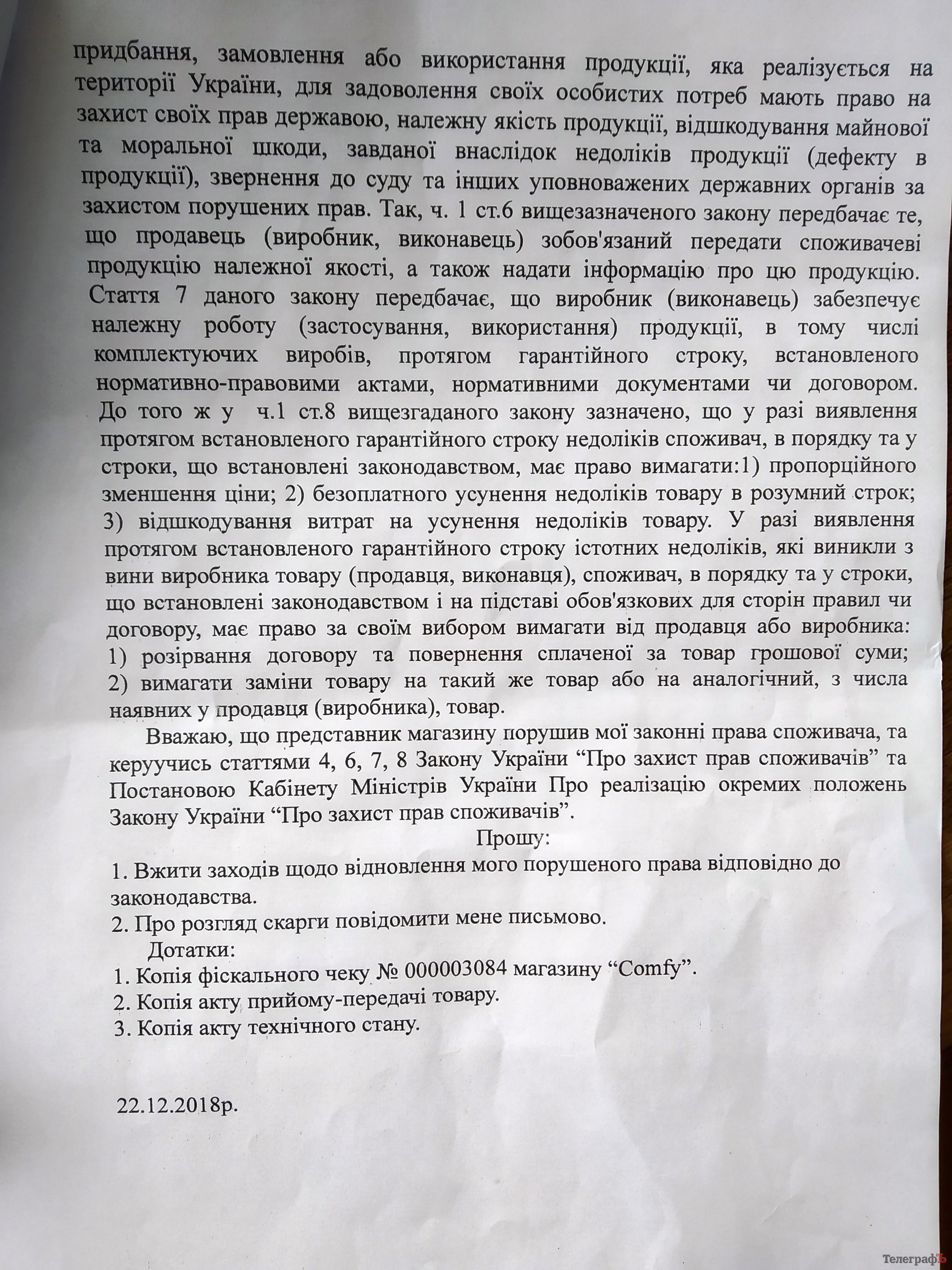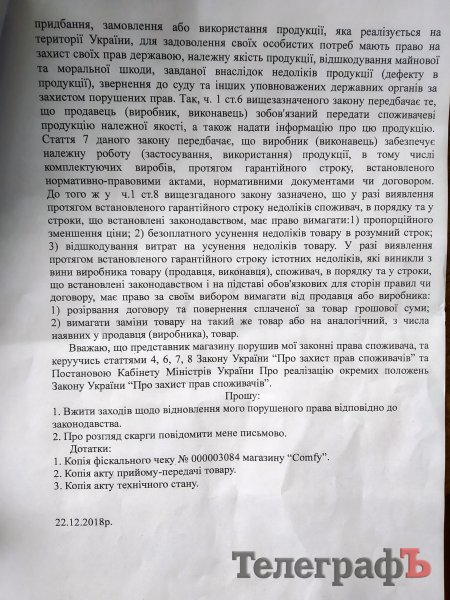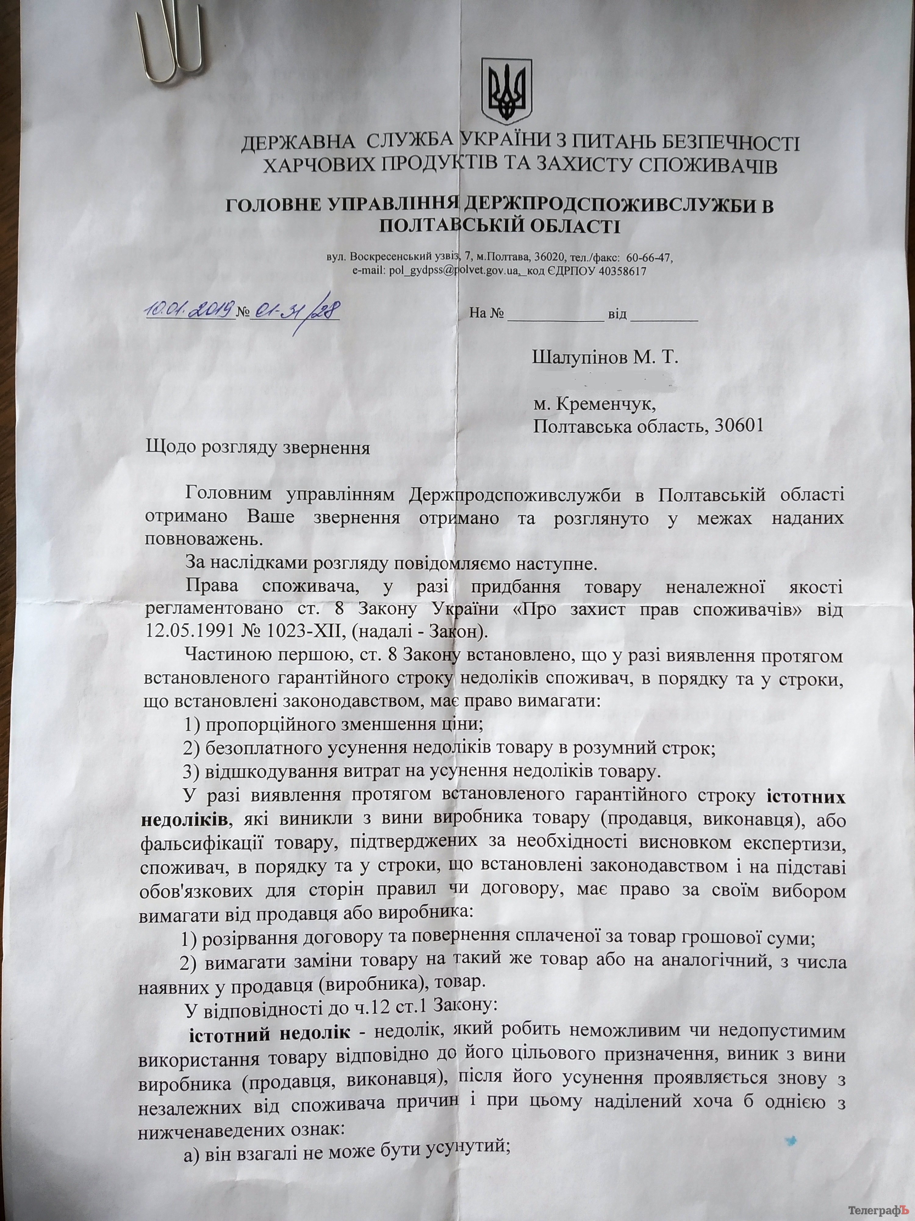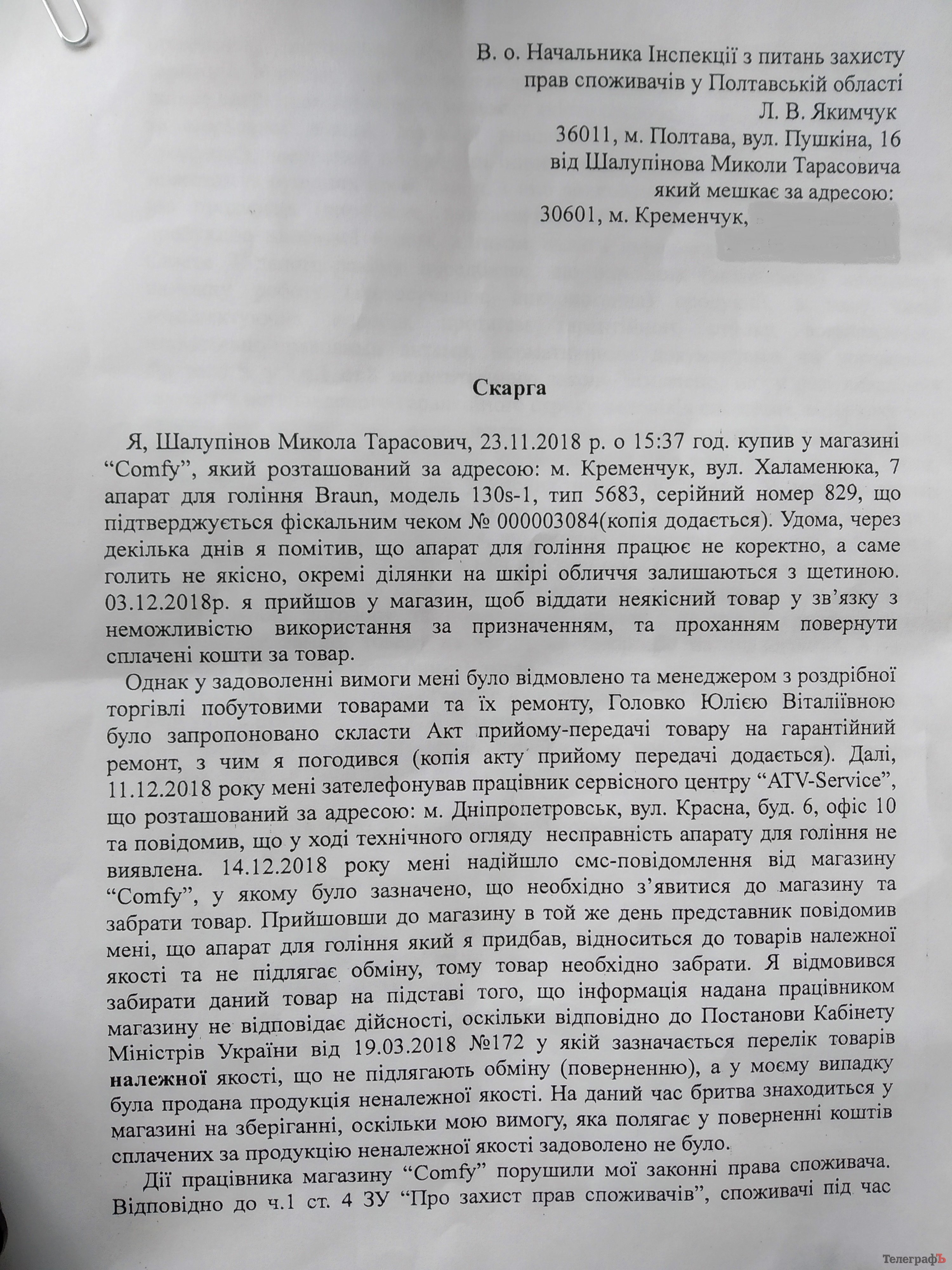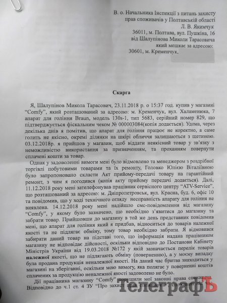 Микола звернувся з допомогою у Кременчуцький місцевий центр з надання безоплатної вторинної правової допомоги. Там йому допомогли скласти скаргу, яку відправили в Інспекцію з питань захисту прав споживачів у Полтавській області.