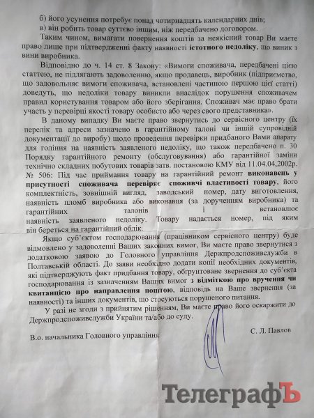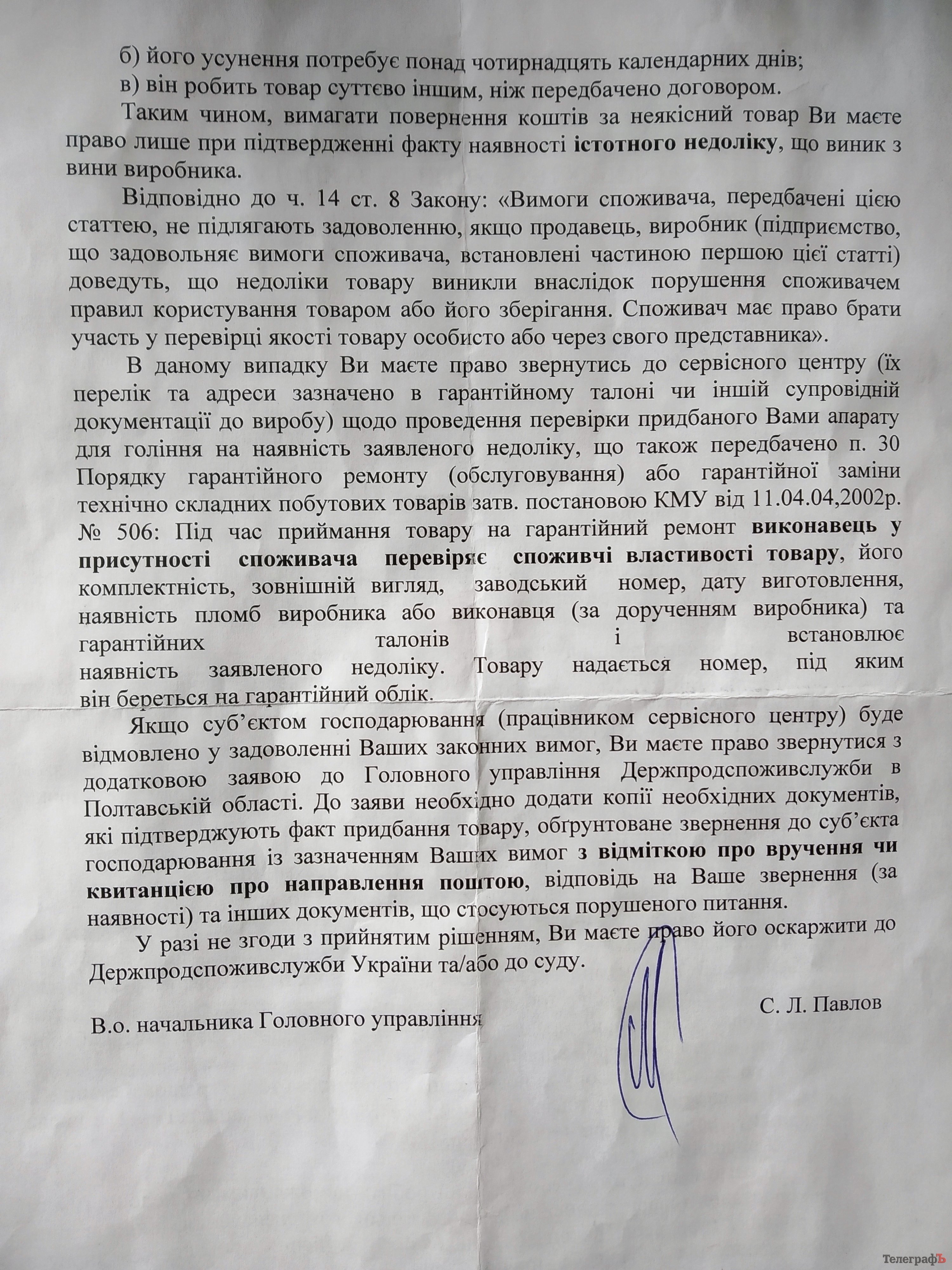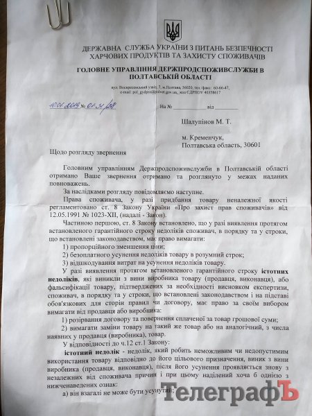 На скаргу Миколи відповіли з Головного управління Держпродспоживслужби в Полтавській області. У відповіді йдеться про те, що вимагати повернення коштів або замінити товару можна у разі виявлення протягом гарантійного строку істотних недоліків.
