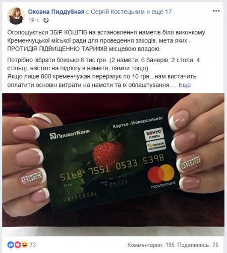 На своей странице в Фейсбук Оксана Пиддубная разместила реквизиты банковской карты, на которую можно перечислять деньги. Взнос предлагают сделать вполне скромный – 10 гривен.