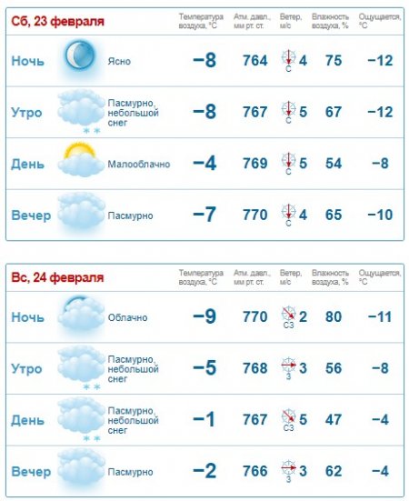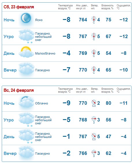 Gismeteo кроме мороза обещает нам небольшой снег утром субботы, 23 февраля, и днём воскресенья, 24 февраля.