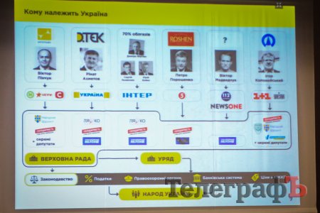 Очень наглядна инфографика, подготовленная кандидатом Деревянко. Используя её, он рассказал, кто из украинских олигархов какими телеканалами владеет, и какие политические партии содержит.
