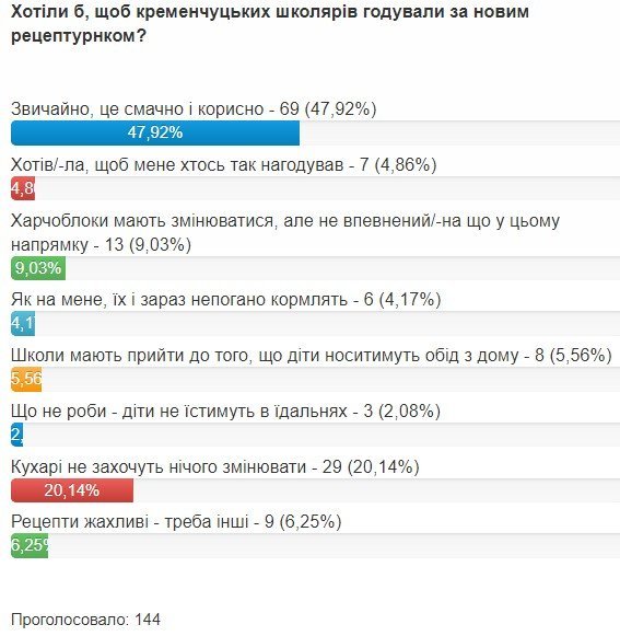 Цікаво, що згідно з опитуванням на нашому сайті, більшість читачів «Телеграфа» хотіли б, аби школярів годували за новим збірником. Але значна частина переконана, що кухарі у їдальнях не захочуть нічого змінювати…