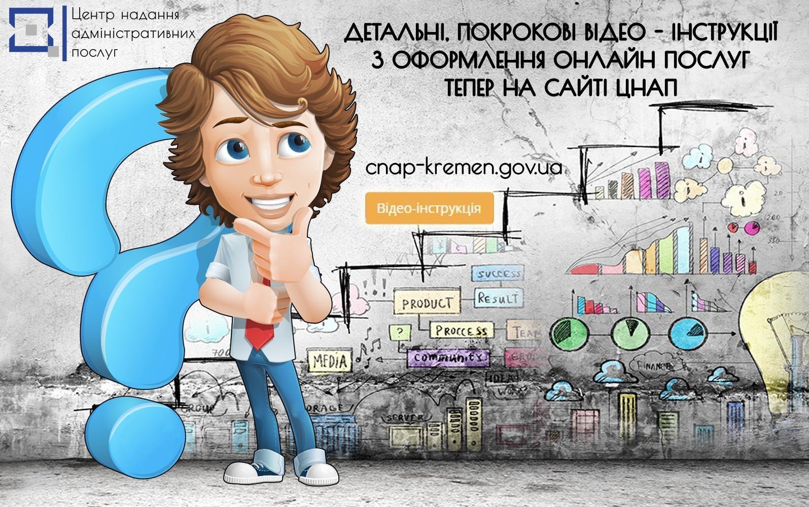 Для зручності замовників у частині оформлення адміністративних послуг в режимі он-лайн на сайті ЦНАПу Кременчука розміщені покрокові детальні відео інструкції. Ці підказки можна знайти за посиланням: cnap-kremen.gov.ua у вкладці «Онлайн послуги».