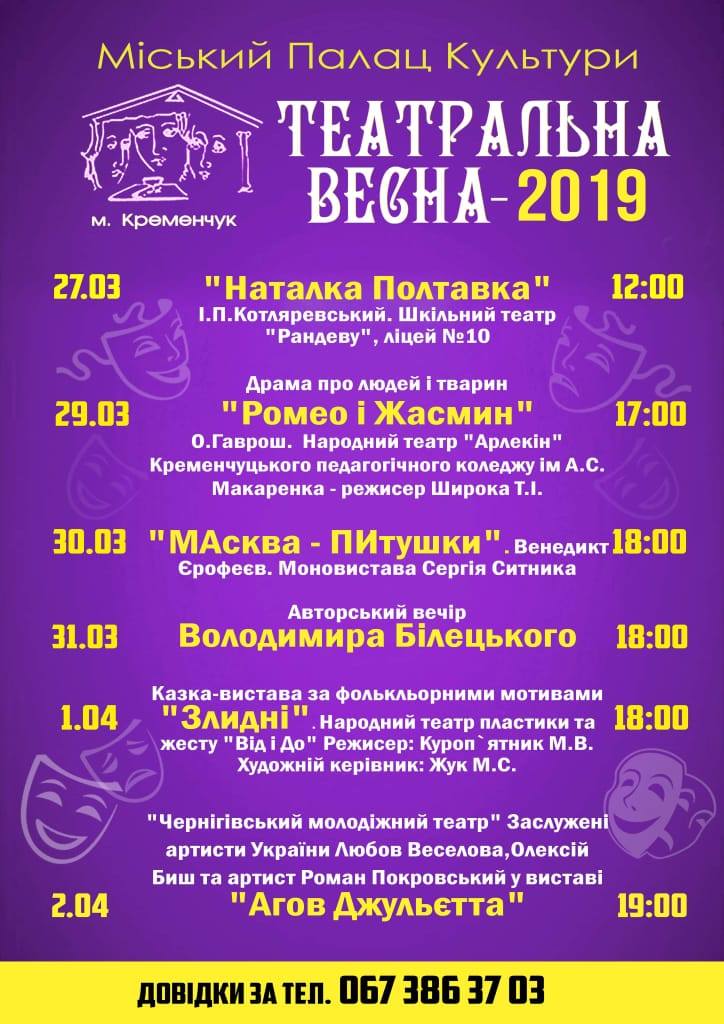 В этом году фестиваль «Театральная весна» в Кременчуге будет длится неделю – с 27 марта по 2 апреля включительно. За это время кременчужанам покажут 6 спектаклей: