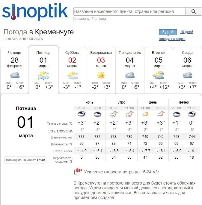 Сообщение об усилении скорости ветра до 15-24 м/с есть на Sinoptik. По их прогнозу, утром ожидается мелкий дождь со снегом, который к полудню должен закончиться.