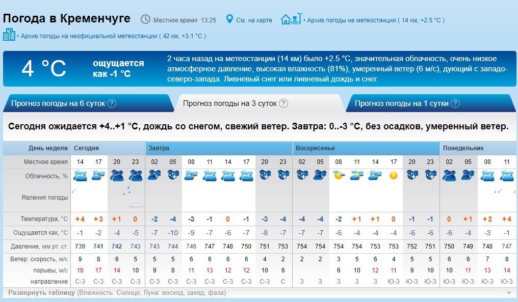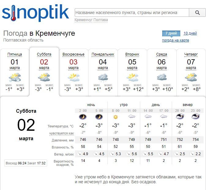 По прогнозу Ventusky, в субботу, 2 марта, весь день в Кременчуге будет мороз от -4°С до -1°С, а ближе к обеду возможен снег. В воскресенье, 3 марта, из-за туч выйдет солнышко и воздух прогреется до 0°С.